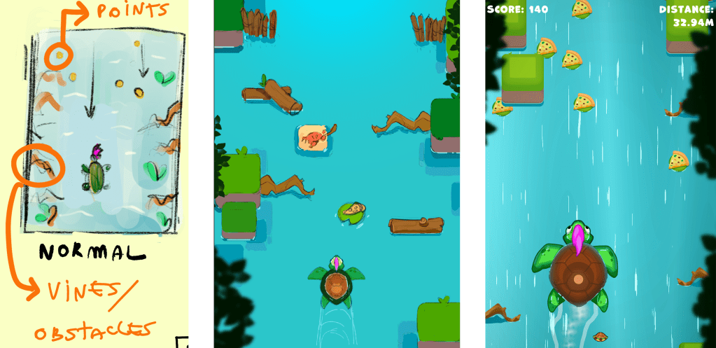 Punk Turtle was developed following the Game Jam’s theme: Scale. In Punk Turtle, you play as the charismatic punk turtle that can increase and decrease its size to avoid obstacles and collect pizza. Increasing its size makes the turtle move slower, but it also increases its collection radius. Alternatively, decreasing its size makes the turtle move faster but also reduces its collection radius considerably.